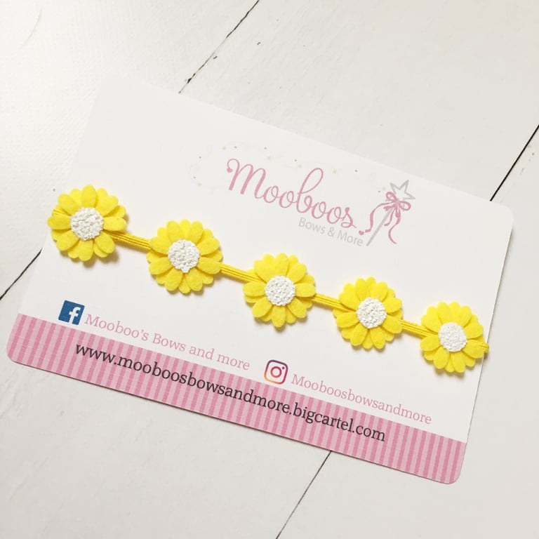 A new addition to the Daisy Chain family our mini Daisy headbands are perfect for little heads. Made using 100% pure wool felt and premium glitter centres. Each Daisy measures approx 1"